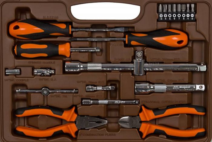 Набор инструментов состоит из предметов в пластиковом кейсе. Инструменты изготовлены из качественной легированной хром-ванадиевой стали. Набор инструмента — это инструменты высокого качества.